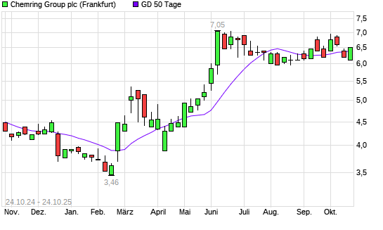 Mit dem Anstieg auf 6,40 EUR hat die Chemring Group-Aktie am 23.10.2025 die 50-Tage-Linie nach oben gekreuzt.Die Chemring Group-Aktie befindet sich seit dem 15.04.2025 im langfristigen Aufwärtstrend ...weiterlesen