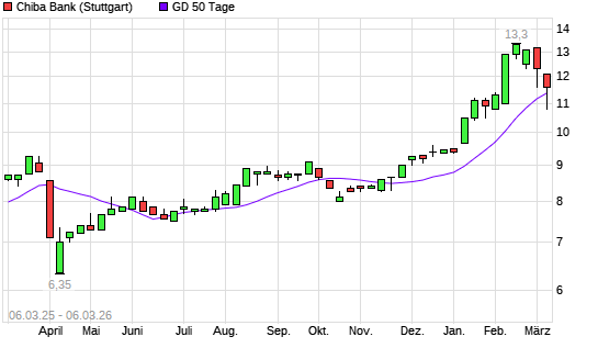 Mit dem Anstieg auf 11,60 EUR hat die Chiba Bank-Aktie am 05.03.2026 die 50-Tage-Linie nach oben gekreuzt.Die Chiba Bank-Aktie befindet sich seit dem 20.10.2025 im ...weiterlesen