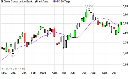 Mit dem Anstieg auf 0,85 EUR hat die China Construction Bank-Aktie am 20.10.2025 die 50-Tage-Linie nach oben gekreuzt.Die China Construction Bank-Aktie befindet sich seit dem 14.10.2025 im langfristigen ...weiterlesen