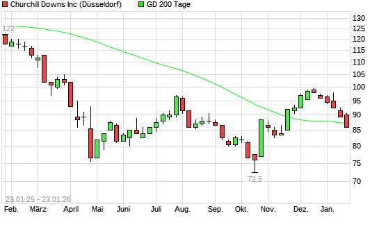 Mit dem Rücksetzer auf 87,00 EUR hat die Churchill Downs-Aktie am 22.01.2026 die 200-Tage-Linie nach unten gekreuzt.Die Churchill Downs-Aktie befand sich seit dem 19.11.2025 im langfristigen ...weiterlesen