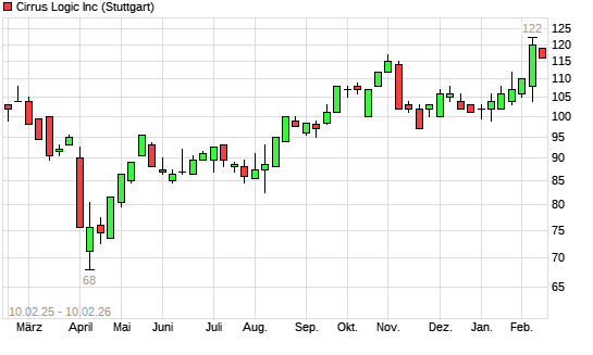 Mit dem Anstieg auf 119,00 EUR hat die Cirrus Logic-Aktie (ISIN US1727551004) am 09.02.2026 ein neues 12-Monats-Hoch erreicht und damit den Kurs vom 06.02.2026 eingestellt.Die Cirrus Logic-Aktie ...weiterlesen
