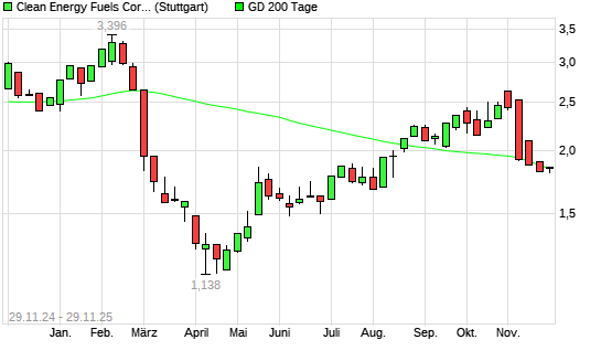 Mit dem Anstieg auf 1,86 EUR hat die Clean Energy Fuels Corp-Aktie am 28.11.2025 die 200-Tage-Linie nach oben gekreuzt.Die Clean Energy Fuels Corp-Aktie befand sich seit dem 19.11.2025 im langfristigen ...weiterlesen