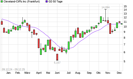 Mit dem Anstieg auf 10,78 EUR hat die Cleveland-Cliffs-Aktie am 09.01.2026 die 100-Tage-Linie nach oben gekreuzt.Die Cleveland-Cliffs-Aktie befindet sich seit dem 14.08.2025 im langfristigen ...weiterlesen