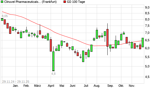 Mit dem Anstieg auf 6,64 EUR hat die Clinuvel Pharmaceuticals-Aktie am 28.11.2025 die 100-Tage-Linie nach oben gekreuzt.Die Clinuvel Pharmaceuticals-Aktie befindet sich seit dem 26.11.2025 im ...weiterlesen