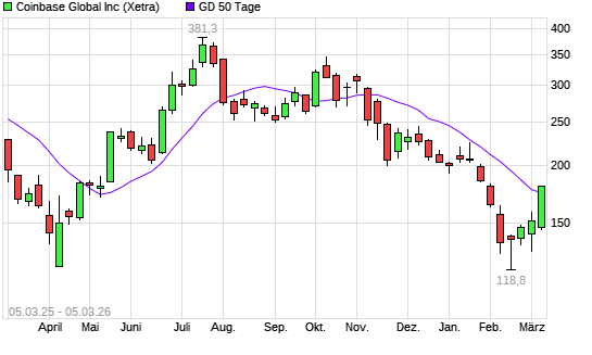 Mit dem Anstieg auf 179,46 EUR hat die Coinbase-Aktie am 04.03.2026 die 50-Tage-Linie nach oben gekreuzt.Die Coinbase-Aktie befindet sich seit dem 13.11.2025 im langfristigen ...weiterlesen