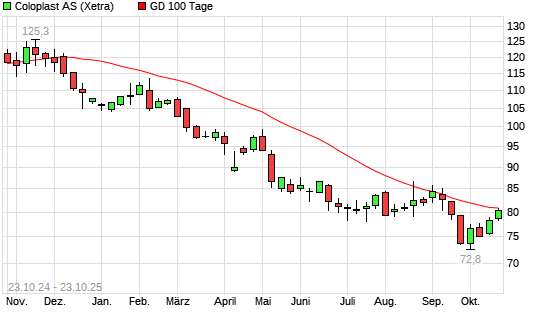 Mit dem Anstieg auf 81,14 EUR hat die Coloplast-Aktie am 22.10.2025 die 100-Tage-Linie nach oben gekreuzt.Die Coloplast-Aktie befindet sich seit dem 05.12.2024 im langfristigen Abwärtstrend ...weiterlesen