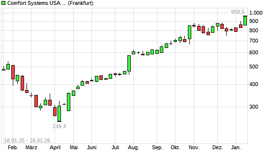 Mit dem Anstieg auf 947,50 EUR hat die Comfort Systems-Aktie (ISIN US1999081045) am 15.01.2026 ein neues All-Time-High erreicht und damit den Kurs vom 13.01.2026 eingestellt.Die Comfort Systems-Aktie ...weiterlesen
