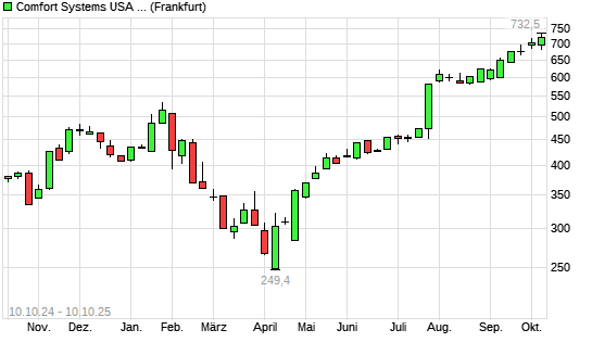 Mit dem Anstieg auf 732,50 EUR hat die Comfort Systems-Aktie (ISIN US1999081045) am 09.10.2025 ein neues All-Time-High erreicht und damit den Kurs vom 08.10.2025 eingestellt.Die Comfort Systems-Aktie ...weiterlesen