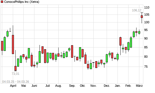 Mit dem Anstieg auf 101,58 EUR hat die ConocoPhillips-Aktie (ISIN US20825C1045) am 03.03.2026 ein neues 12-Monats-Hoch erreicht und damit den Kurs vom 02.03.2026 ...weiterlesen