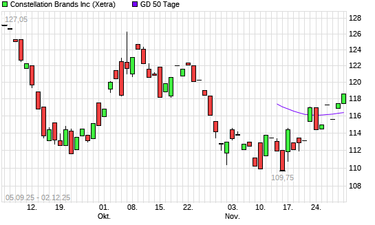 Mit dem Anstieg auf 119,05 EUR hat die Constellation Brands-Aktie am 01.12.2025 die 50-Tage-Linie nach oben gekreuzt.Die Constellation Brands-Aktie befindet sich seit dem 11.12.2024 im langfristigen ...weiterlesen