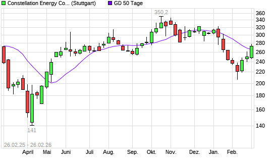 Mit dem Anstieg auf 275,35 EUR hat die Constellation Energy Corporation-Aktie am 25.02.2026 die 50-Tage-Linie nach oben gekreuzt.Die Constellation Energy Corporation-Aktie befindet ...weiterlesen