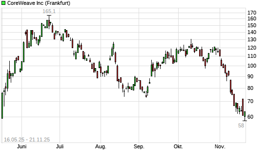 Mit dem Rücksetzer auf 61,00 EUR hat die CoreWeave-Aktie (ISIN US21873S1087) am 20.11.2025 ein neues All-Time-Low erreicht und damit den Kurs vom 19.11.2025 eingestellt.Der Abstand ...weiterlesen