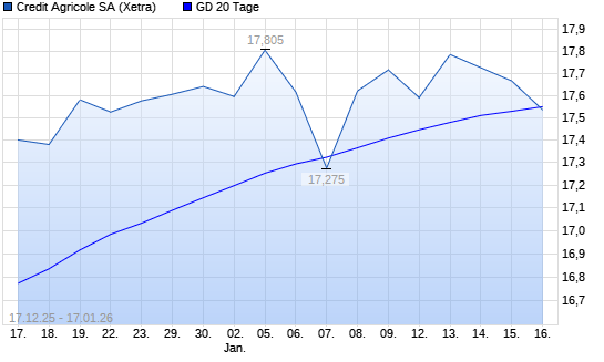 Mit dem Rücksetzer auf 17,38 EUR hat die Credit Agricole-Aktie am 16.01.2026 die 20-Tage-Linie nach unten gekreuzt.Die Credit Agricole-Aktie befindet sich seit dem 26.11.2025 im langfristigen ...weiterlesen