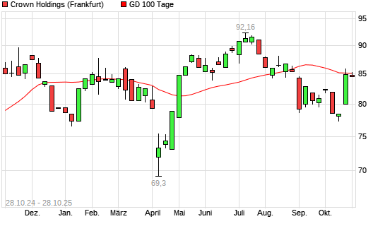 Mit dem Anstieg auf 85,30 EUR hat die Crown Holdings-Aktie am 27.10.2025 die 100-Tage-Linie nach oben gekreuzt.Die Crown Holdings-Aktie befindet sich seit dem 21.10.2025 im langfristigen Aufwärtstrend ...weiterlesen