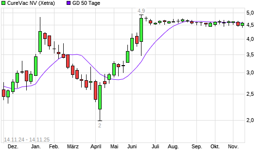Mit dem Rücksetzer auf 4,55 EUR hat die CureVac-Aktie am 13.11.2025 die 50-Tage-Linie nach unten gekreuzt.Die CureVac-Aktie befindet sich seit dem 28.04.2025 im langfristigen Aufwärtstrend ...weiterlesen