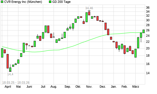 Mit dem Anstieg auf 25,66 EUR hat die Cvr Energy-Aktie am 17.03.2026 die 200-Tage-Linie nach oben gekreuzt.Die Cvr Energy-Aktie befand sich seit dem 18.12.2025 im ...weiterlesen