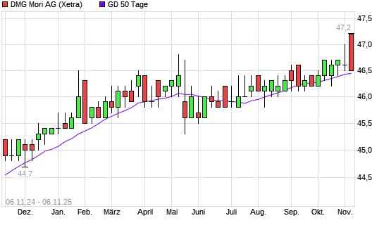 Mit dem Rücksetzer auf 46,20 EUR hat die DMG Mori-Aktie am 05.11.2025 die 50-Tage-Linie nach unten gekreuzt.Die DMG Mori-Aktie befindet sich seit dem 06.08.2024 im langfristigen Aufwärtstrend ...weiterlesen