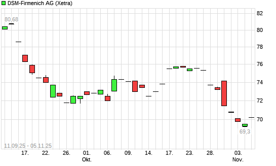 Mit dem Rücksetzer auf 69,40 EUR hat die DSM-Firmenich-Aktie (ISIN CH1216478797) am 04.11.2025 ein neues All-Time-Low erreicht und damit den Kurs vom 03.11.2025 eingestellt.Die DSM-Firmenich-Aktie ...weiterlesen