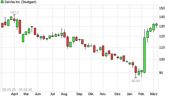 Mit dem Anstieg auf 132,55 EUR hat die DaVita-Aktie (ISIN US23918K1088) am 04.03.2026 ein neues 6-Monats-Hoch erreicht und damit den Kurs vom 27.02.2026 eingestellt.Die ...weiterlesen