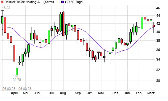 Mit dem Rücksetzer auf 41,11 EUR hat die Daimler Truck-Aktie am 05.03.2026 die 50-Tage-Linie nach unten gekreuzt.Die Daimler Truck-Aktie befindet sich seit dem 05.01.2026 ...weiterlesen