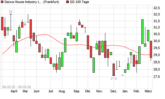 Mit dem Rücksetzer auf 28,60 EUR hat die Daiwa House Industry-Aktie am 05.03.2026 die 100-Tage-Linie nach unten gekreuzt.Die Daiwa House Industry-Aktie befindet sich seit ...weiterlesen