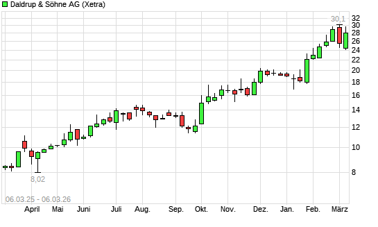 Mit dem Anstieg auf 29,20 EUR hat die Daldrup & Söhne-Aktie (ISIN DE0007830572) am 05.03.2026 ein neues 10-Jahres-Hoch erreicht und damit den Kurs vom 20.02.2026 eingestellt.Die Daldrup ...weiterlesen