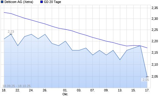 Mit dem Rücksetzer auf 2,10 EUR hat die Delticom-Aktie am 17.10.2025 die 20-Tage-Linie nach unten gekreuzt.Die Delticom-Aktie befindet sich seit dem 19.09.2025 im langfristigen Abwärtstrend ...weiterlesen