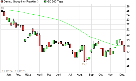 Mit dem Rücksetzer auf 17,90 EUR hat die Dentsu-Aktie am 10.12.2025 die 200-Tage-Linie nach unten gekreuzt.Die Dentsu-Aktie befand sich seit dem 09.12.2025 im langfristigen Aufwärtstrend ...weiterlesen