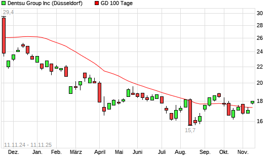 Mit dem Anstieg auf 17,80 EUR hat die Dentsu-Aktie am 10.11.2025 die 100-Tage-Linie nach oben gekreuzt.Die Dentsu-Aktie befindet sich seit dem 15.11.2024 im langfristigen Abwärtstrend und hat ...weiterlesen