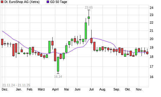 Mit dem Rücksetzer auf 18,26 EUR hat die Deutsche EuroShop-Aktie am 20.11.2025 die 50-Tage-Linie nach unten gekreuzt.Die Deutsche EuroShop-Aktie befindet sich seit dem 24.10.2025 im langfristigen ...weiterlesen