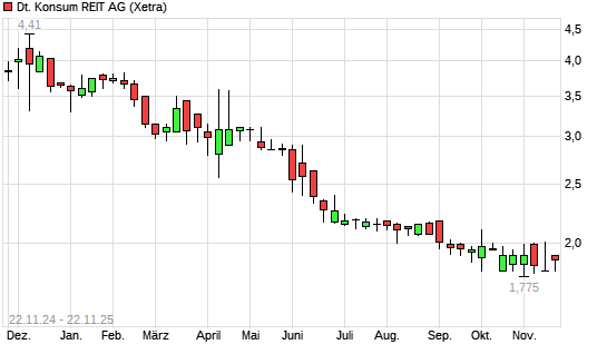 Mit dem Rücksetzer auf 1,69 EUR hat die Deutsche Konsum REIT-Aktie (ISIN DE000A14KRD3) am 21.11.2025 ein neues All-Time-Low erreicht und damit den Kurs vom 06.11.2025 eingestellt.Die Deutsche ...weiterlesen