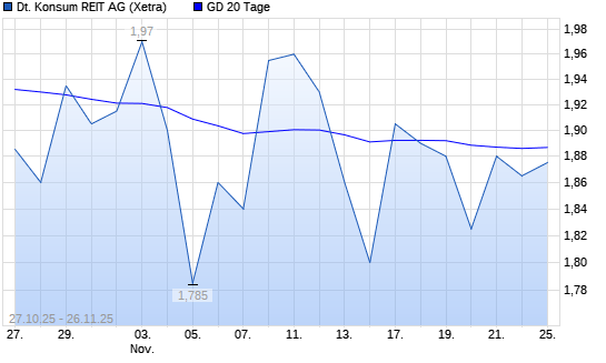 Mit dem Rücksetzer auf 1,77 EUR hat die Deutsche Konsum REIT-Aktie am 25.11.2025 die 20-Tage-Linie nach unten gekreuzt.Die Deutsche Konsum REIT-Aktie befindet sich seit dem 17.02.2025 im ...weiterlesen