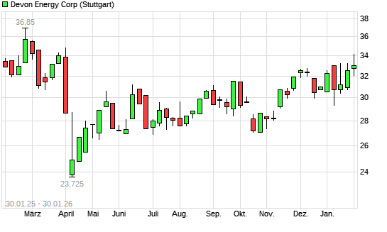 Mit dem Anstieg auf 34,02 EUR hat die Devon Energy-Aktie (ISIN US25179M1036) am 29.01.2026 ein neues 6-Monats-Hoch erreicht und damit den Kurs vom 26.01.2026 eingestellt.Die Devon Energy-Aktie ...weiterlesen