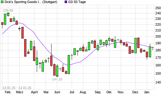 Mit dem Rücksetzer auf 180,24 EUR hat die Dick's Sporting Goods-Aktie am 12.01.2026 die 50-Tage-Linie nach unten gekreuzt.Die Dick's Sporting Goods-Aktie befindet sich seit dem 09.01.2026 ...weiterlesen