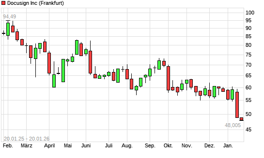 Mit dem Rücksetzer auf 48,01 EUR hat die Docusign-Aktie (ISIN US2561631068) am 19.01.2026 ein neues 12-Monats-Tief erreicht und damit den Kurs vom 16.01.2026 eingestellt.Die Docusign-Aktie ...weiterlesen