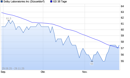 Mit dem Anstieg auf 58,00 EUR hat die Dolby-Aktie am 28.11.2025 die 38-Tage-Linie nach oben gekreuzt.Die Dolby-Aktie befindet sich seit dem 03.04.2025 im langfristigen Abwärtstrend und hat in ...weiterlesen
