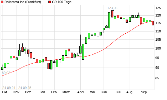 Mit dem Rücksetzer auf 113,90 EUR hat die Dollarama-Aktie am 23.09.2025 die 100-Tage-Linie nach unten gekreuzt.Der Abstand zur 200-Tage-Linie beträgt aktuell +6,83%. ##trendBox## ...weiterlesen