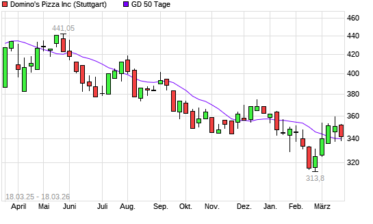 Mit dem Anstieg auf 341,75 EUR hat die Domino's-Aktie am 17.03.2026 die 50-Tage-Linie nach oben gekreuzt.Die Domino's-Aktie befindet sich seit dem 02.06.2025 im langfristigen ...weiterlesen
