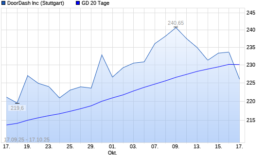 Mit dem Rücksetzer auf 227,70 EUR hat die DoorDash-Aktie am 16.10.2025 die 20-Tage-Linie nach unten gekreuzt.Die DoorDash-Aktie befindet sich seit dem 02.08.2024 im langfristigen Aufwärtstrend ...weiterlesen