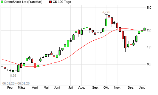 Mit dem Anstieg auf 2,02 EUR hat die DroneShield-Aktie am 05.01.2026 die 100-Tage-Linie nach oben gekreuzt.Die DroneShield-Aktie befindet sich seit dem 19.12.2025 im langfristigen Aufwärtstrend ...weiterlesen