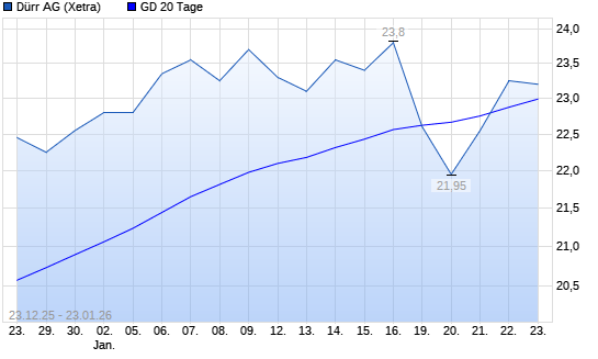 Mit dem Anstieg auf 23,25 EUR hat die Dürr-Aktie am 22.01.2026 die 20-Tage-Linie nach oben gekreuzt.Die Dürr-Aktie befindet sich seit dem 22.12.2025 im langfristigen Aufwärtstrend und hat ...weiterlesen