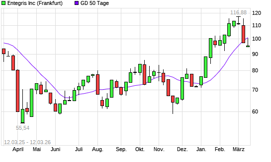 Mit dem Rücksetzer auf 100,16 EUR hat die ENTEGRIS-Aktie am 11.03.2026 die 50-Tage-Linie nach unten gekreuzt.Die ENTEGRIS-Aktie befindet sich seit dem 25.12.2025 im ...weiterlesen
