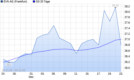 Mit dem Rücksetzer auf 26,80 EUR hat die EVN-Aktie am 23.12.2025 die 20-Tage-Linie nach unten gekreuzt.Die EVN-Aktie befindet sich seit dem 08.09.2025 im langfristigen Aufwärtstrend und ...weiterlesen