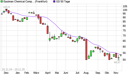 Mit dem Anstieg auf 53,74 EUR hat die Eastman Chemical Company-Aktie am 14.11.2025 die 50-Tage-Linie nach oben gekreuzt.Die Eastman Chemical Company-Aktie befindet sich seit dem 04.03.2025 im ...weiterlesen