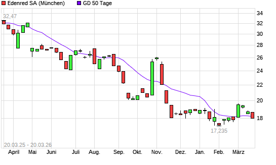 Mit dem Rücksetzer auf 17,82 EUR hat die Edenred-Aktie am 19.03.2026 die 50-Tage-Linie nach unten gekreuzt.Die Edenred-Aktie befindet sich seit dem 07.03.2025 im ...weiterlesen