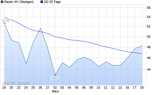 Mit dem Anstieg auf 45,80 EUR hat die Elastic-Aktie am 18.03.2026 die 20-Tage-Linie nach oben gekreuzt.Die Elastic-Aktie befindet sich seit dem 21.11.2025 im langfristigen Abwärtstrend ...weiterlesen