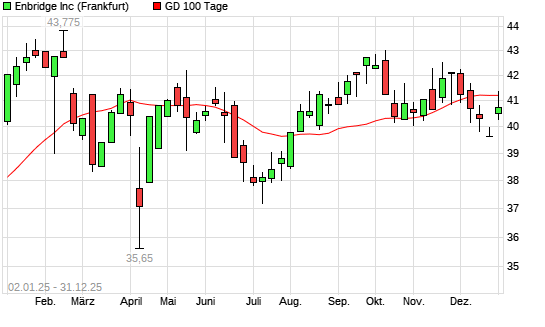 Mit dem Anstieg auf 41,62 EUR hat die Enbridge-Aktie am 30.12.2025 die 100-Tage-Linie nach oben gekreuzt.Die Enbridge-Aktie befindet sich seit dem 29.12.2025 im langfristigen Aufwärtstrend und ...weiterlesen