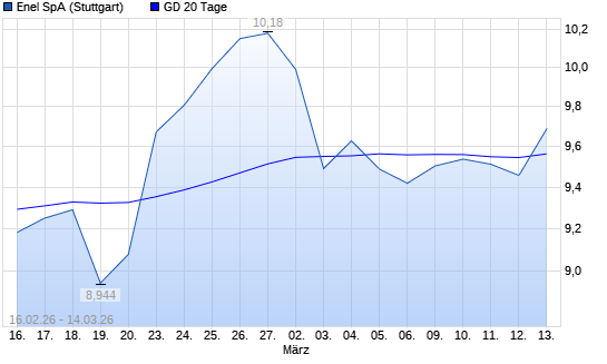 Mit dem Anstieg auf 9,72 EUR hat die Enel-Aktie am 13.03.2026 die 20-Tage-Linie nach oben gekreuzt.Die Enel-Aktie befindet sich seit dem 09.04.2025 im langfristigen Aufwärtstrend und ...weiterlesen