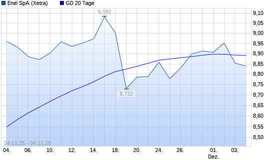 Mit dem Rücksetzer auf 8,88 EUR hat die Enel-Aktie am 03.12.2025 die 20-Tage-Linie nach unten gekreuzt.Die Enel-Aktie befindet sich seit dem 09.04.2025 im langfristigen Aufwärtstrend und ...weiterlesen