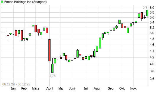Mit dem Anstieg auf 5,85 EUR hat die Eneos-Aktie (ISIN JP3386450005) am 05.12.2025 ein neues 5-Jahres-Hoch erreicht und damit den Kurs vom 17.11.2025 eingestellt.Die Eneos-Aktie befindet sich ...weiterlesen